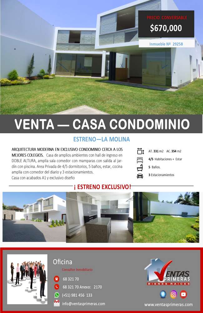 Arquitectura super moderna con amplios ambientes. Super moderna con techo a doble altura con amplio jardín y piscina, 4 dormitorios y el 5to dormitorio en 1er piso, estar, amplio jardín y piscina. Cerca a la Municipalidad y a los mejores colegios.