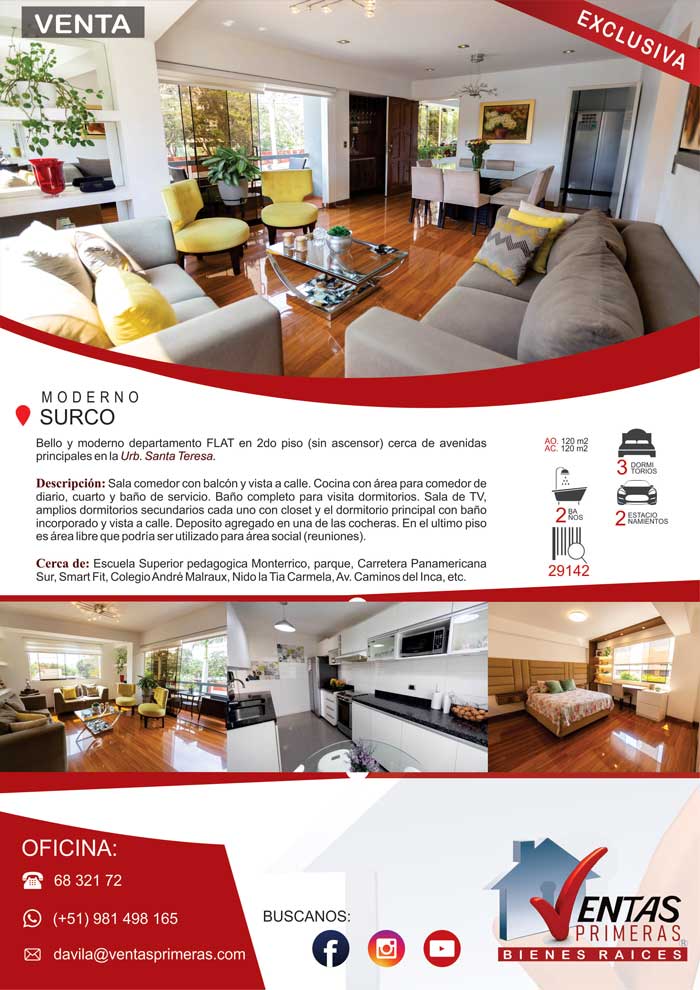 @ventasprimeras Departamento en 2do piso en VENTA. Santa Teresa, Surco 🏠120 m2 Cuenta con: - 3 dormitorios - 2 baños completos - Sala comedor con balcón - Sala de estar - Cocina - Cuarto y baño de servicio - 2 estacionamientos Informes y visitas:📲 981498165 / 981456133 / 947104670 #venta #bienesraices #tour #housetour #moderno #depaenventa #exclusivo #parati #realestate #forsale ♬ Stuck With U - Conor Maynard & Anna Maynard